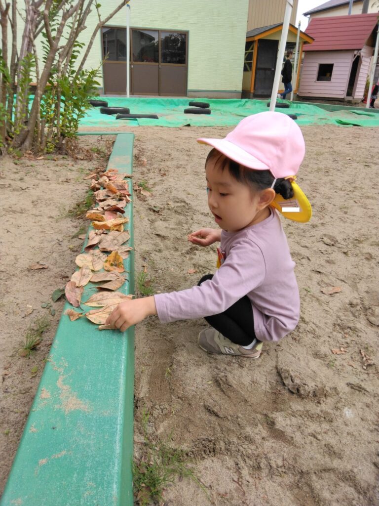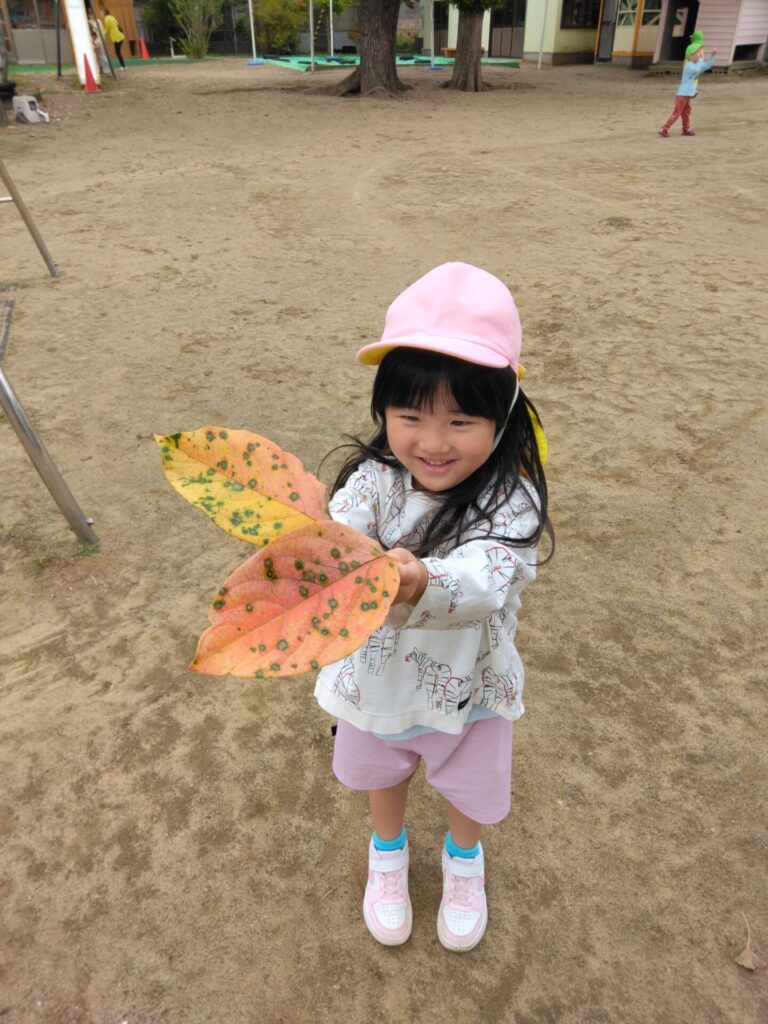 ぐっと寒くなってきましたね🍂園庭の葉っぱも色づき、ひらひらと落ちてきては、子どもたちの目を楽しませてくれています。食べ物になったり、お金になったり、お面になったり、羽根になったり…子どもたちの想像力がどんどん膨らんでいきます。