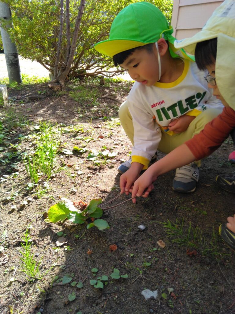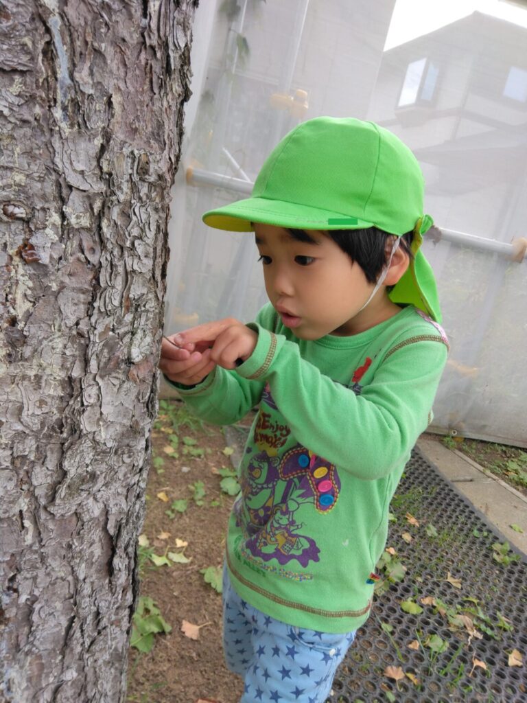 子どもたちは、園庭のことをよーく知っています。顔や洋服にくっつく葉っぱも発見!!「なにか静かにやってるなー」と思ったら、くるっと振り返った顔にはたっくさんの葉っぱ😮「ウォ~!!」と何かになりきっている様子で、叫びながら走っていきました😆秋の自然を少しでも長く楽しめますように♪